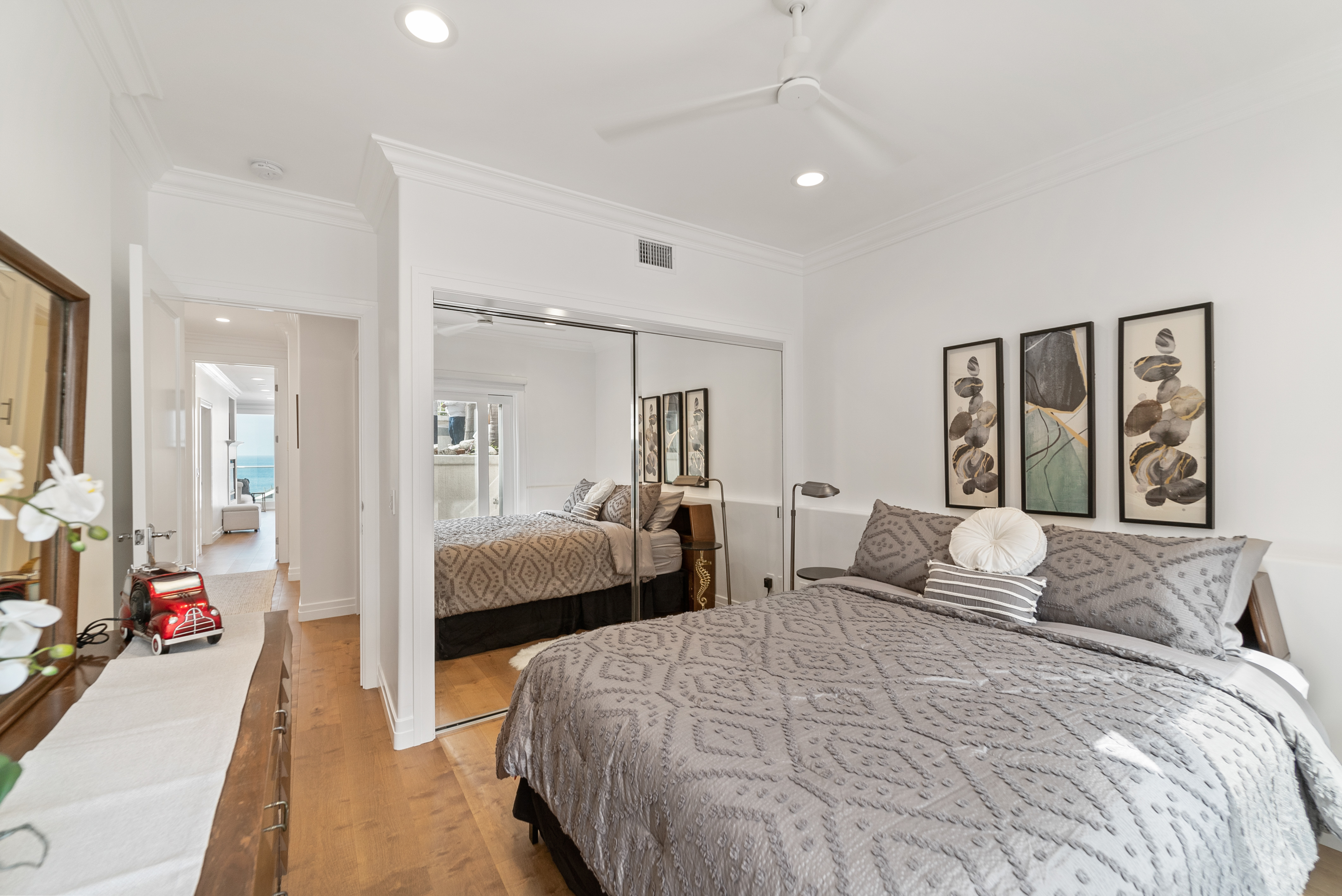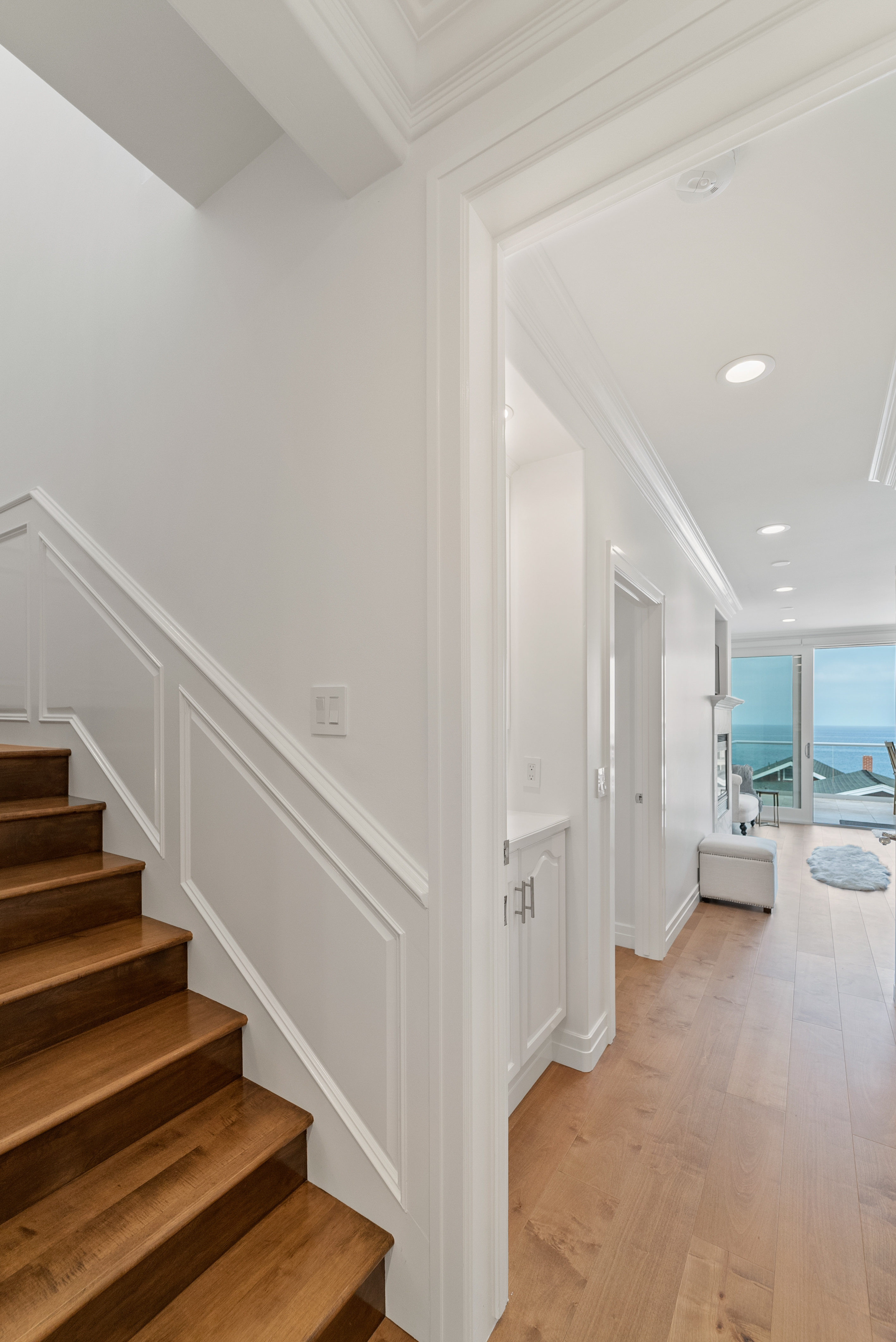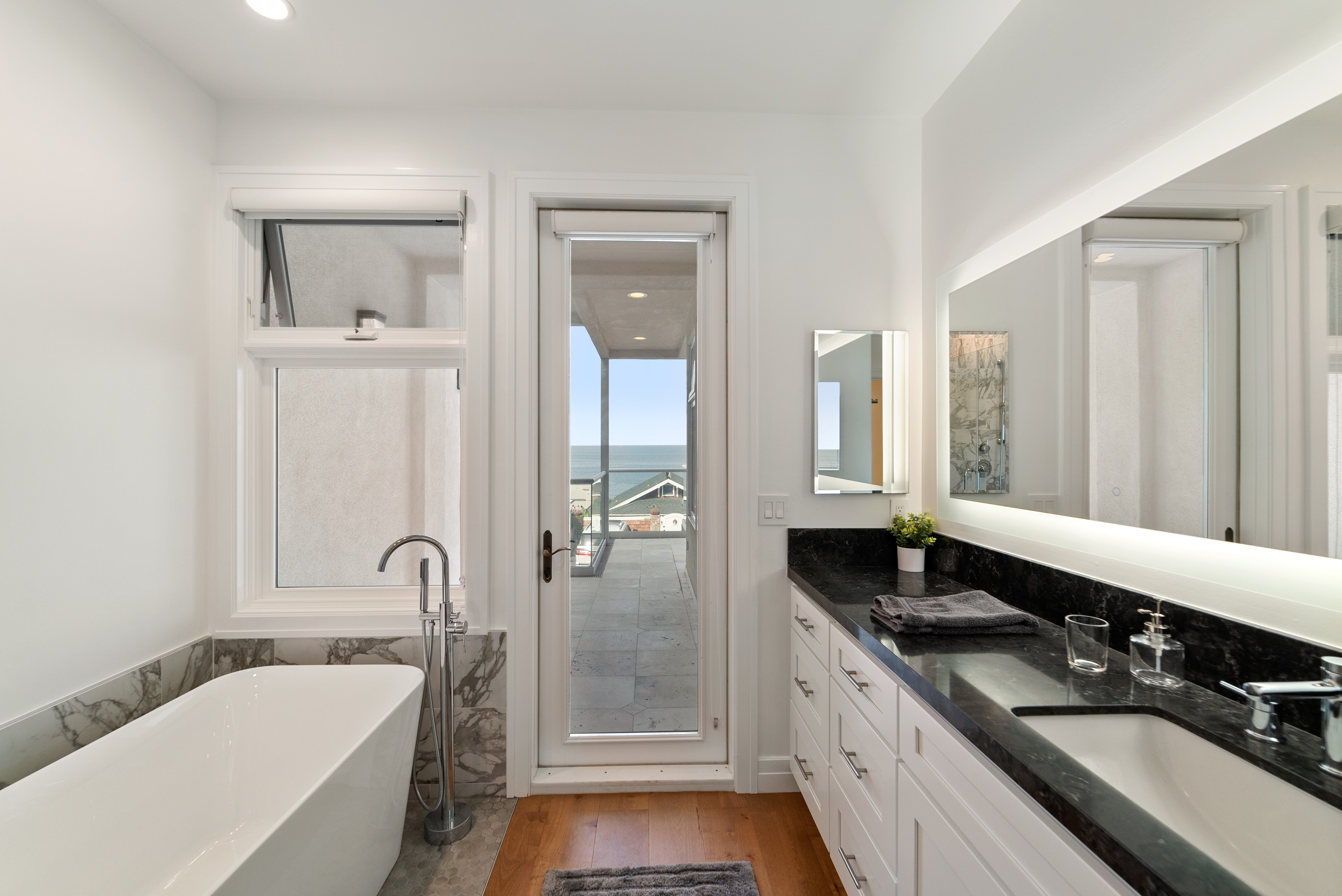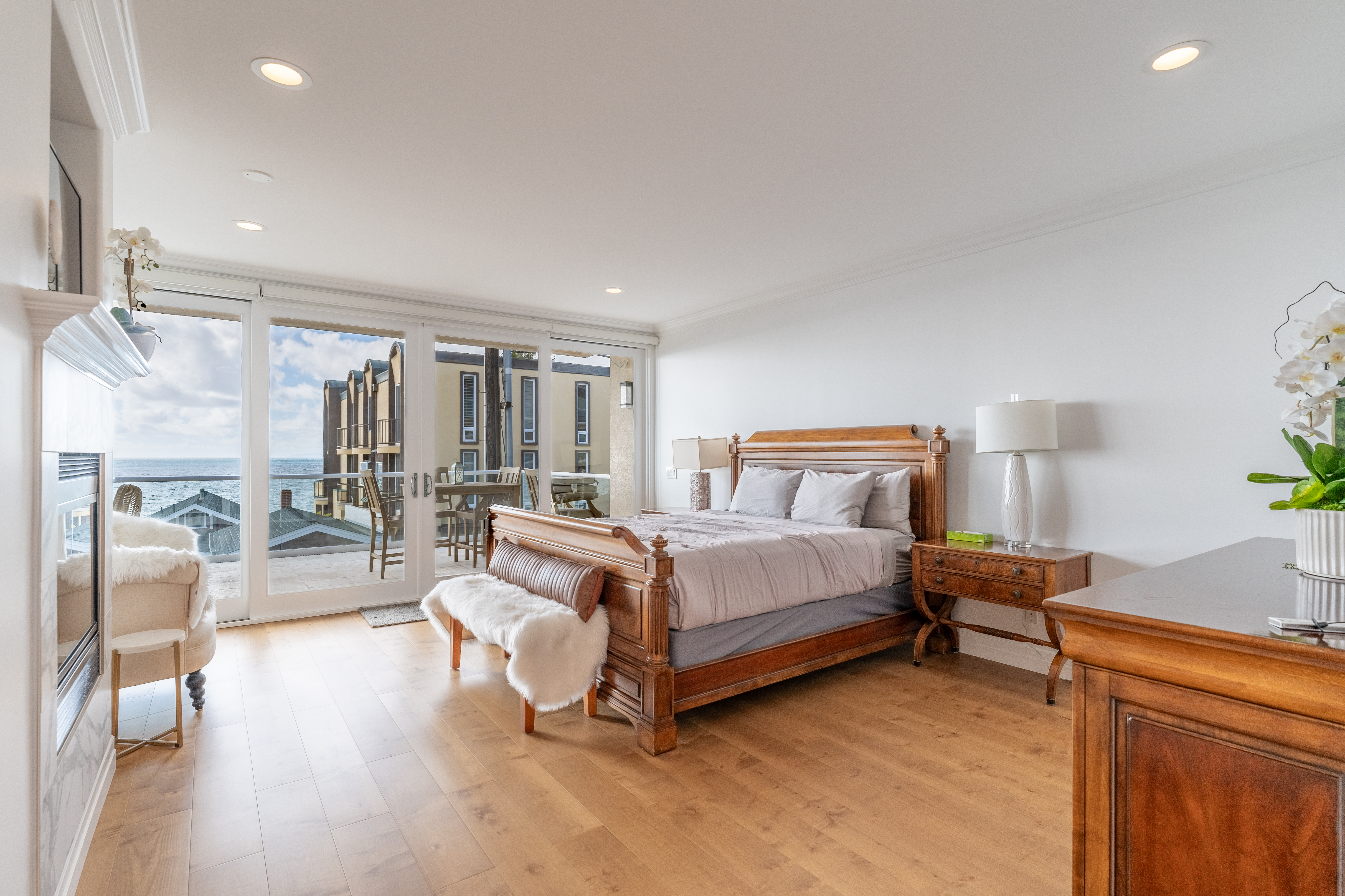 Walk down the stairs to the middle level, where you’ll find the primary suite to your left. Light the fireplace and cozy up in bed while gazing at the ocean. Enjoy a private coastal view balcony accessible from both the bedroom and the en-suite bathroom, which features a separate shower, soaking tub, and water closet.
