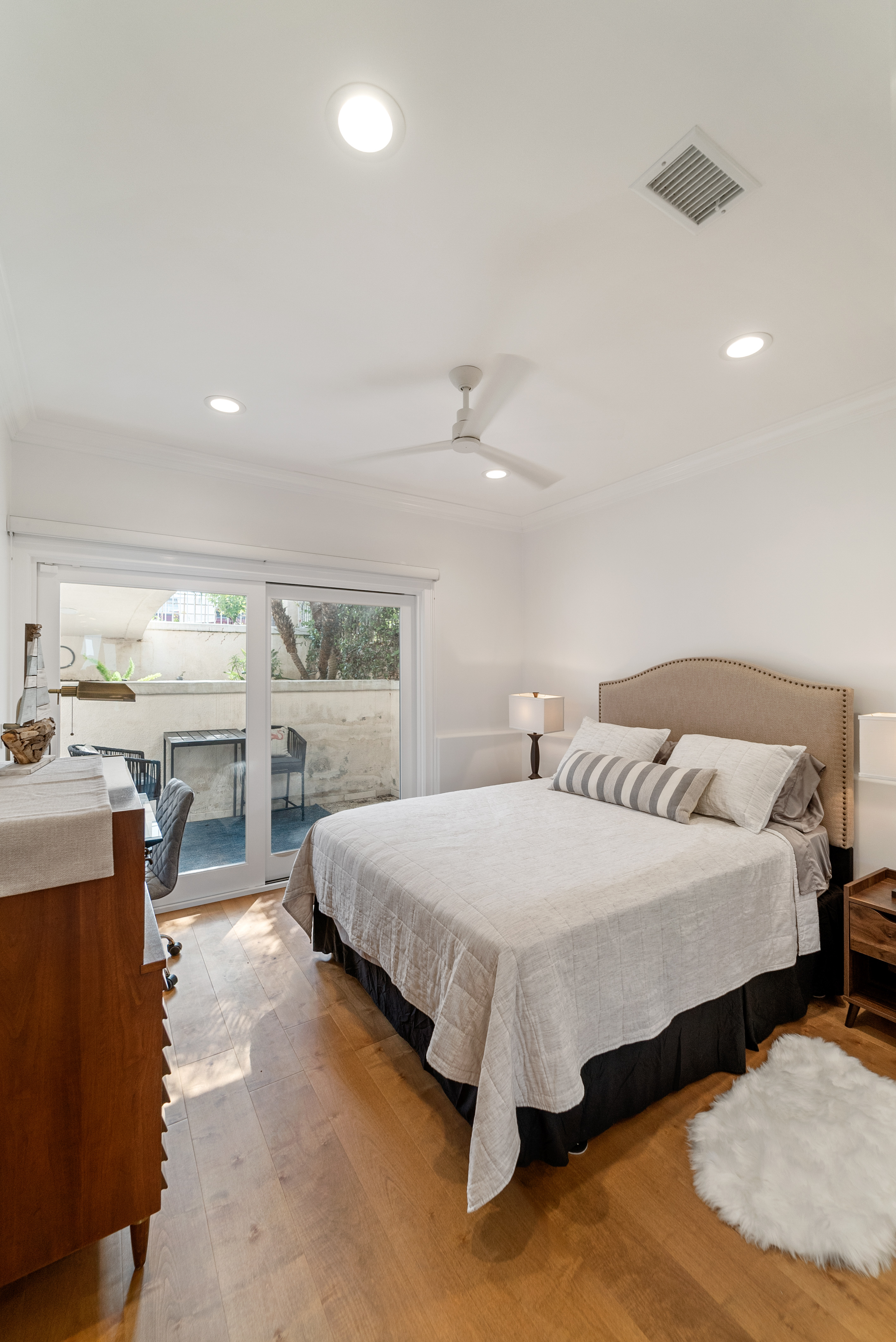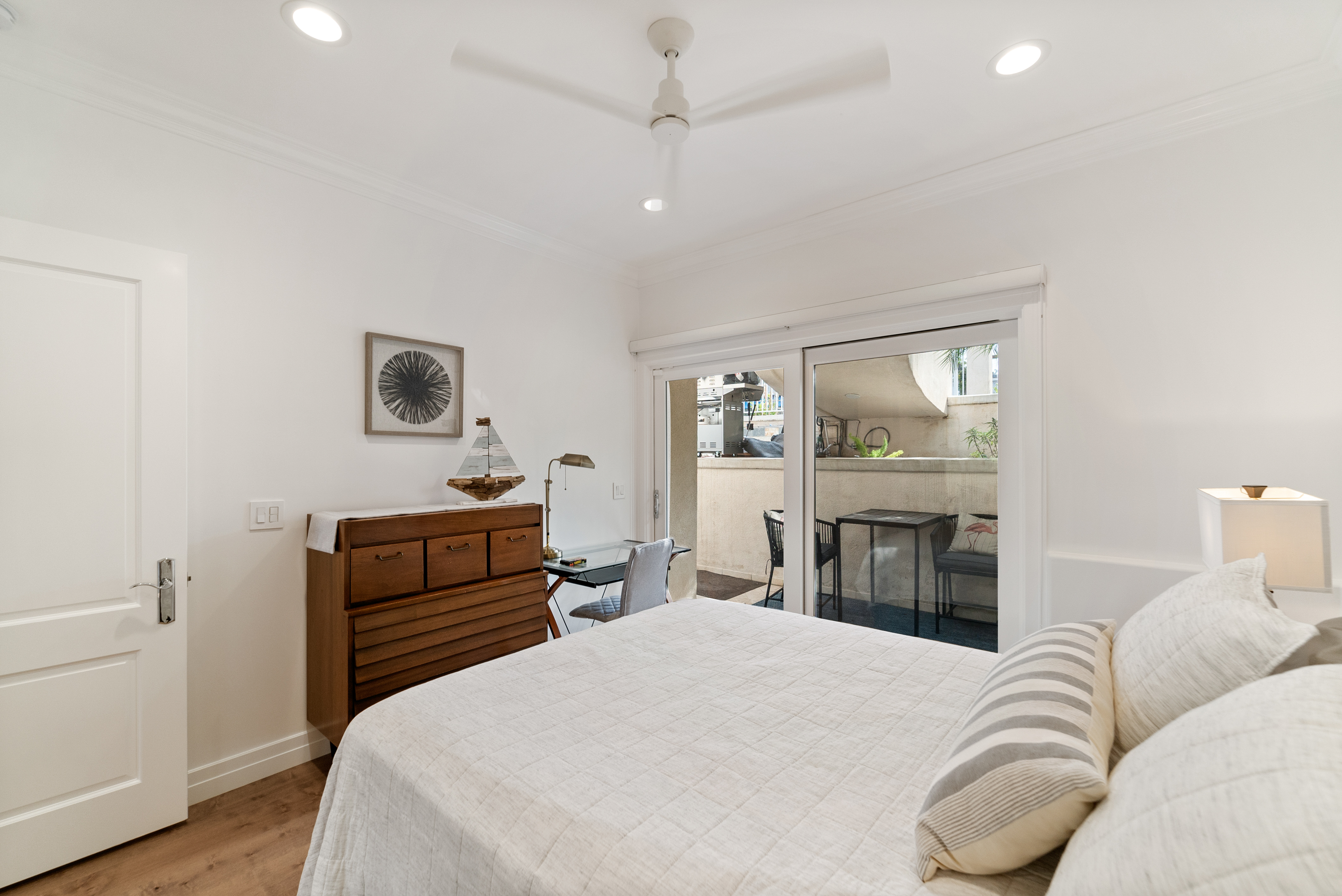 Adjacent secondary bedrooms provide comfortable sleeping quarters, each with sliding glass door access to a private shared patio. The bathroom features a separate soaking tub and luxurious shower.
