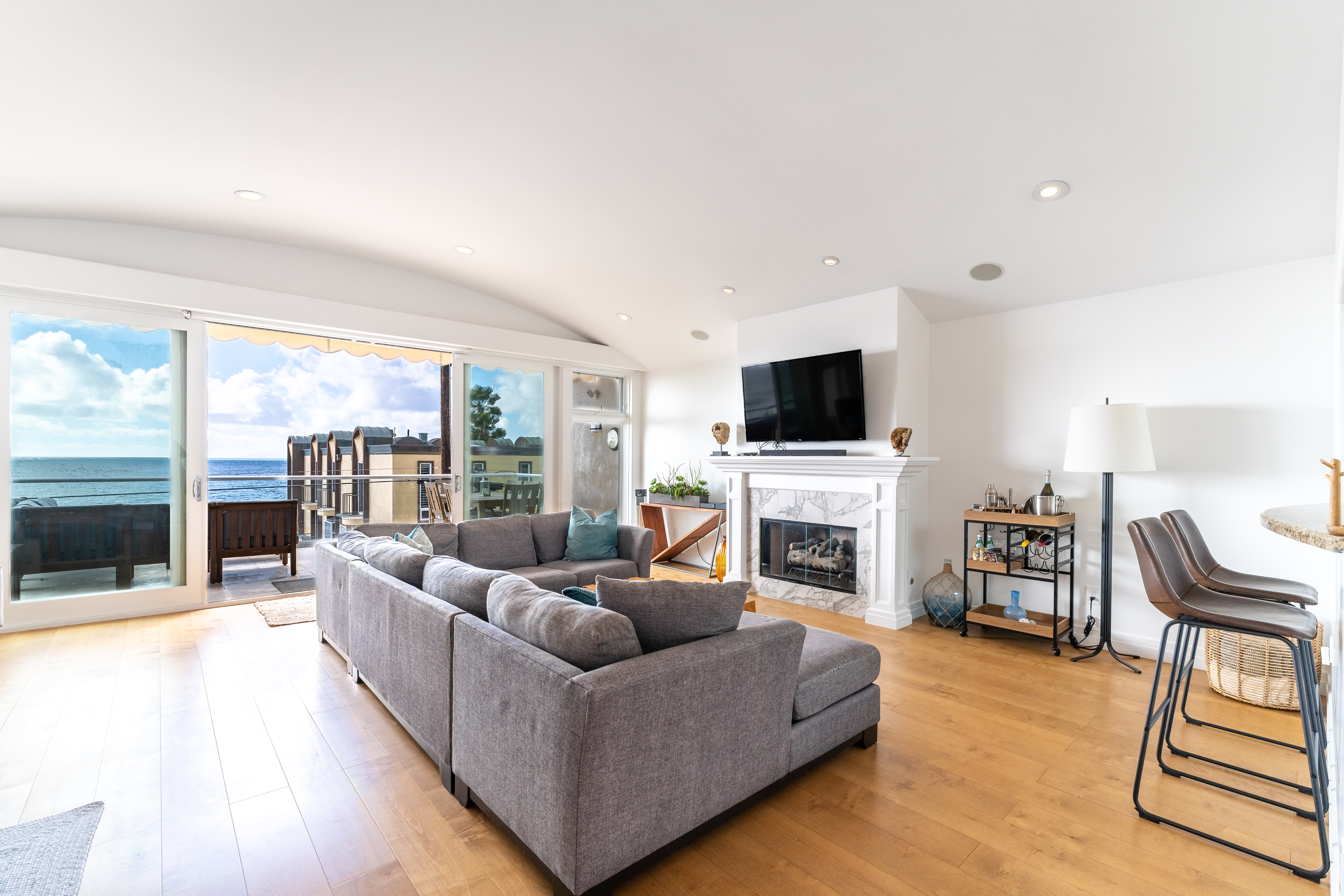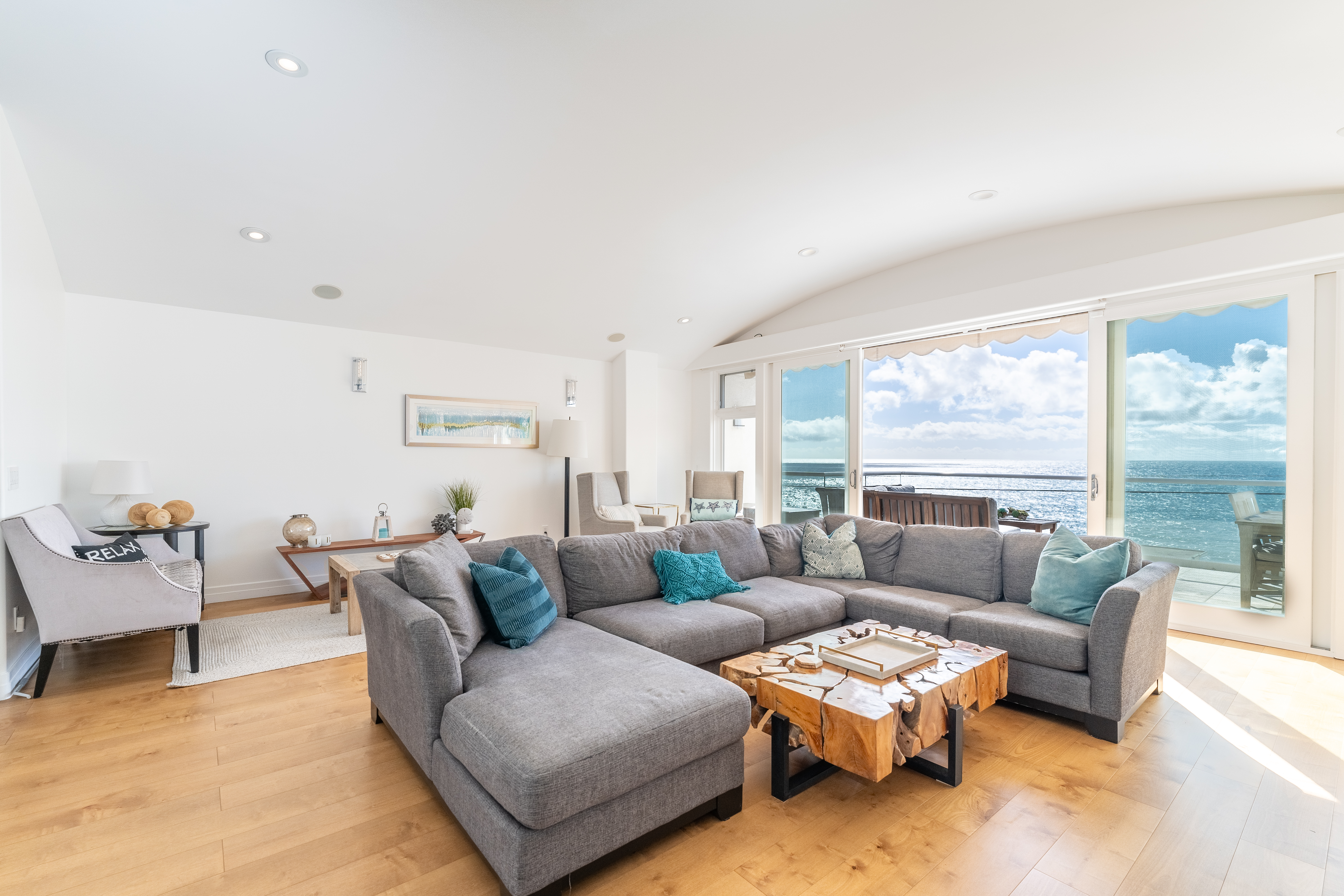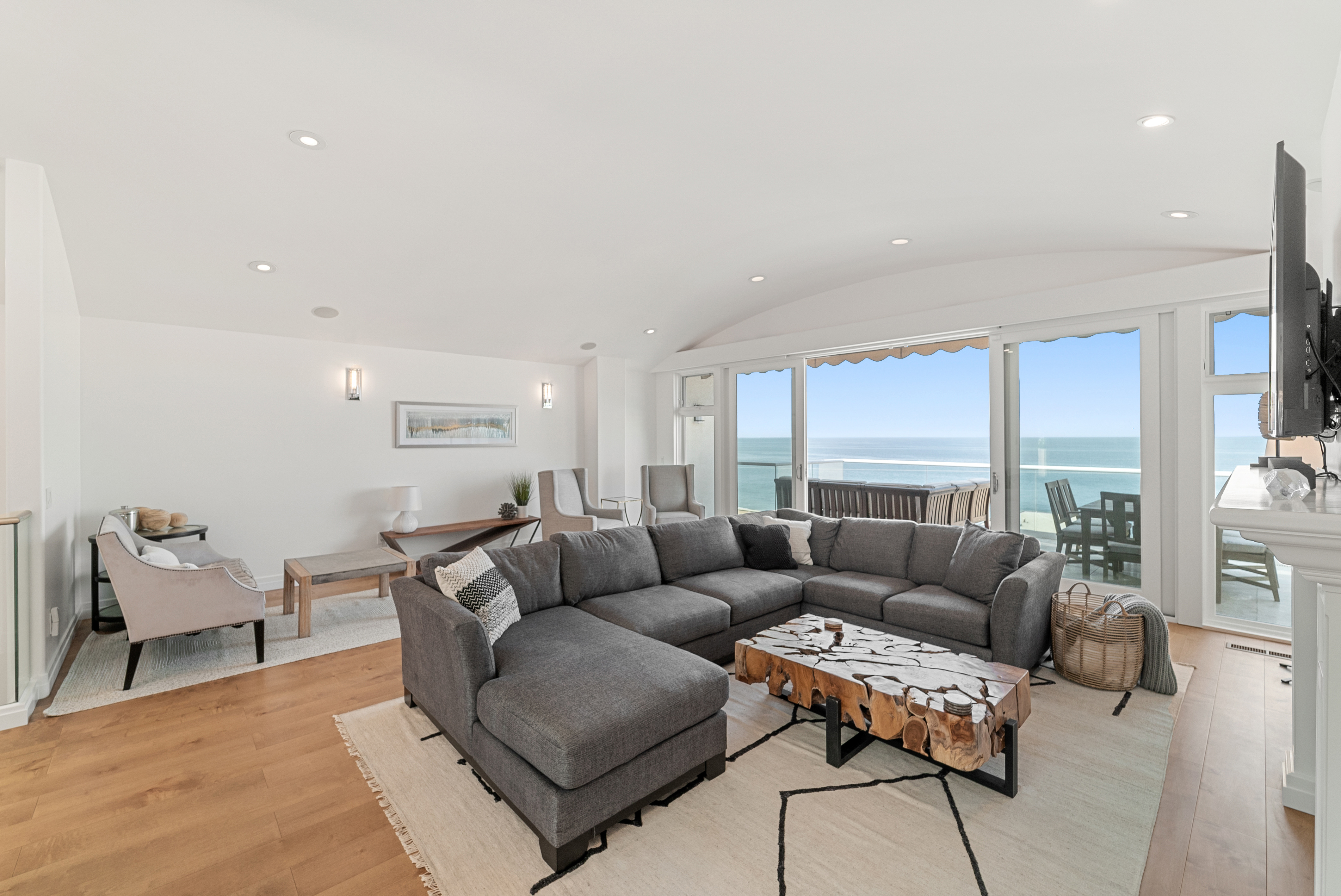 Expansive multi-use space with ocean view as its backdrop. Kick back on the huge sectional sofa, in the arm chair seating area, or around the game table. Sliding glass doors lead out to a large balcony with glass railing that shows off the stunning coastal views. Take in the sea breeze while relaxing at the outdoor dining table or the outdoor sectional sofa and coffee table.