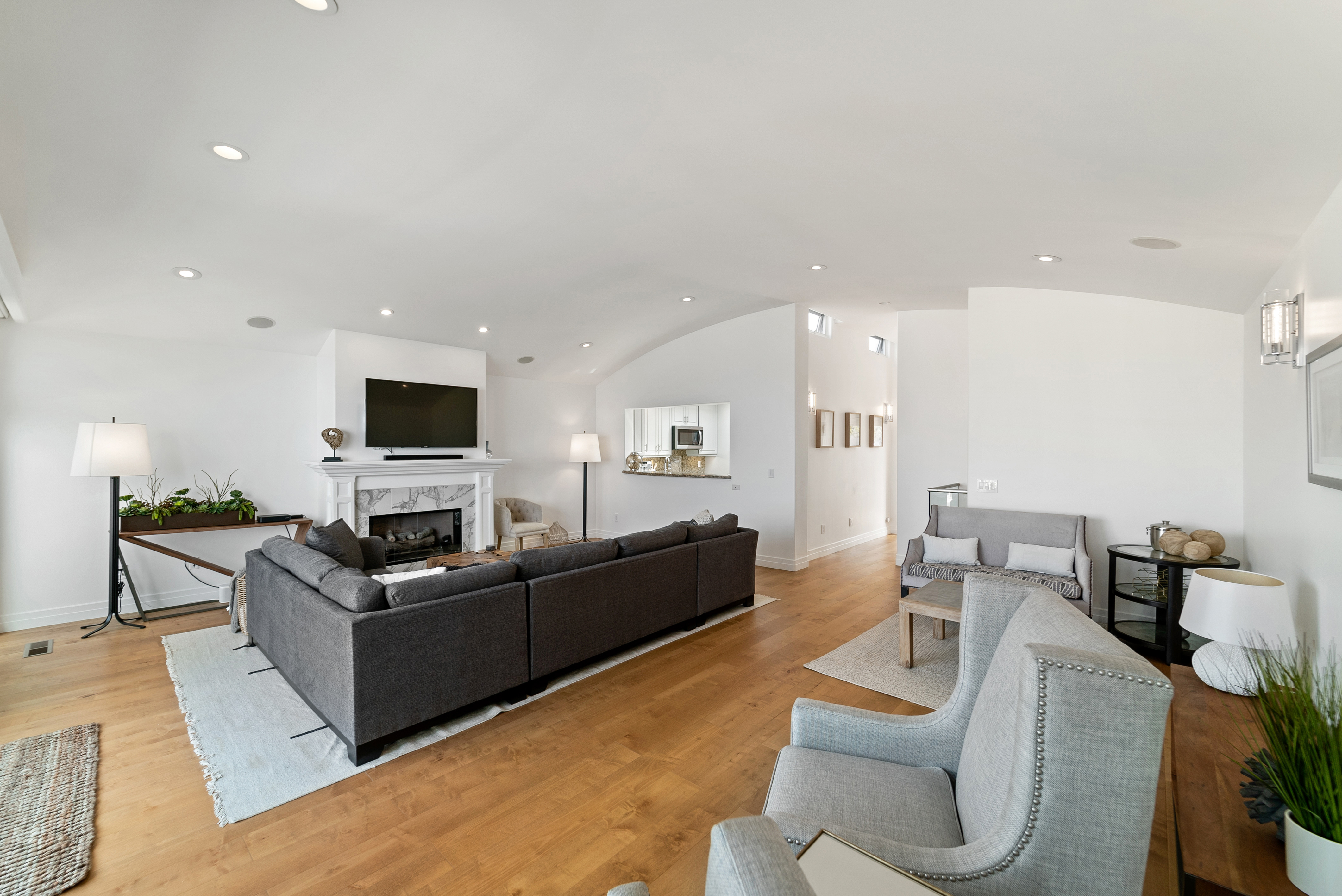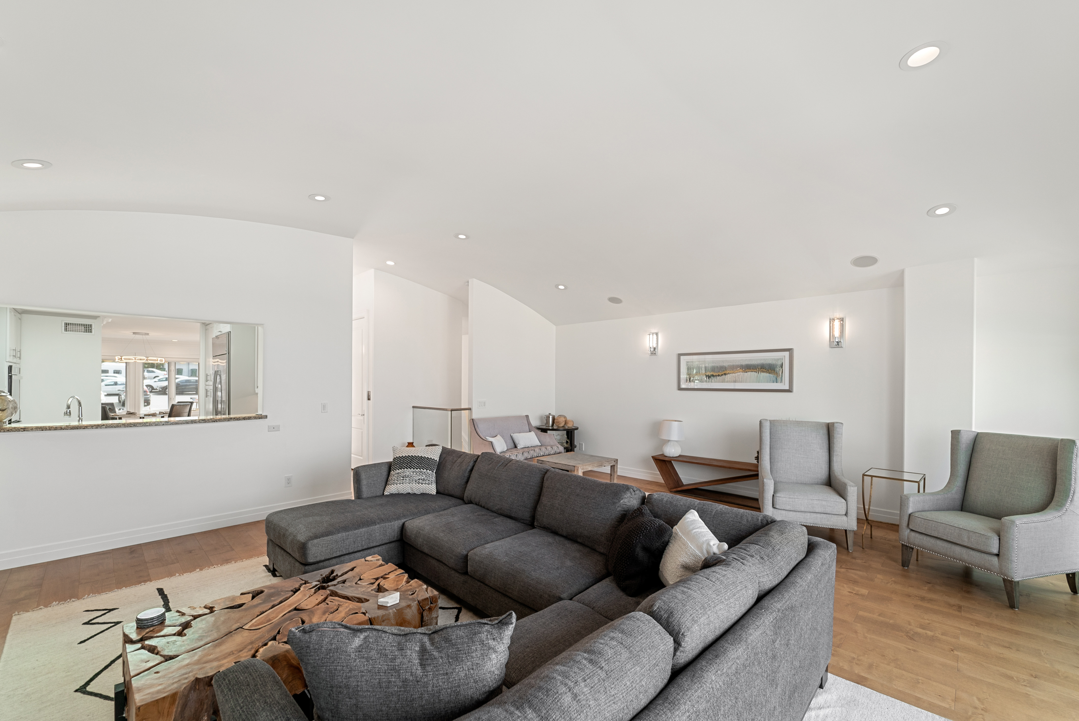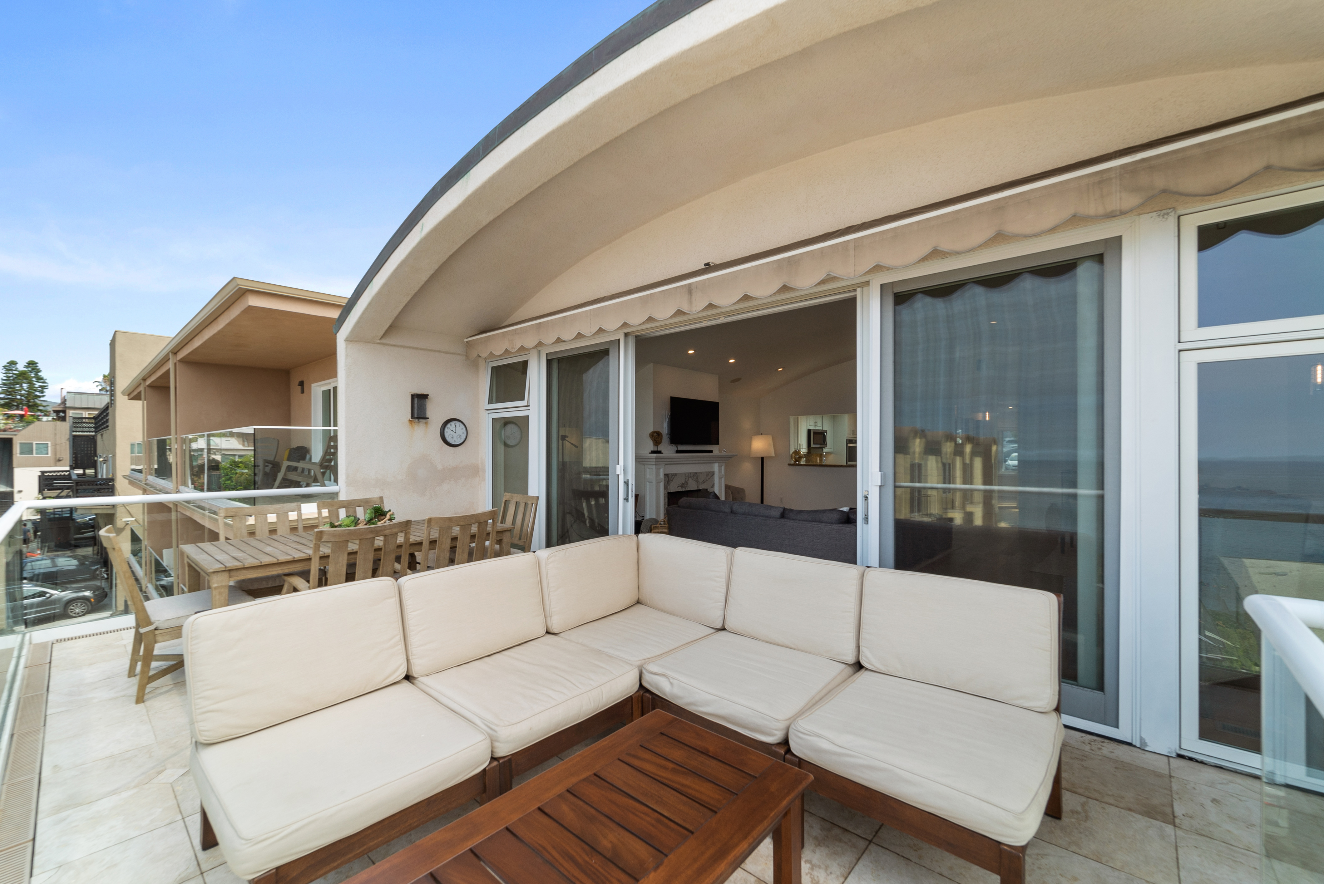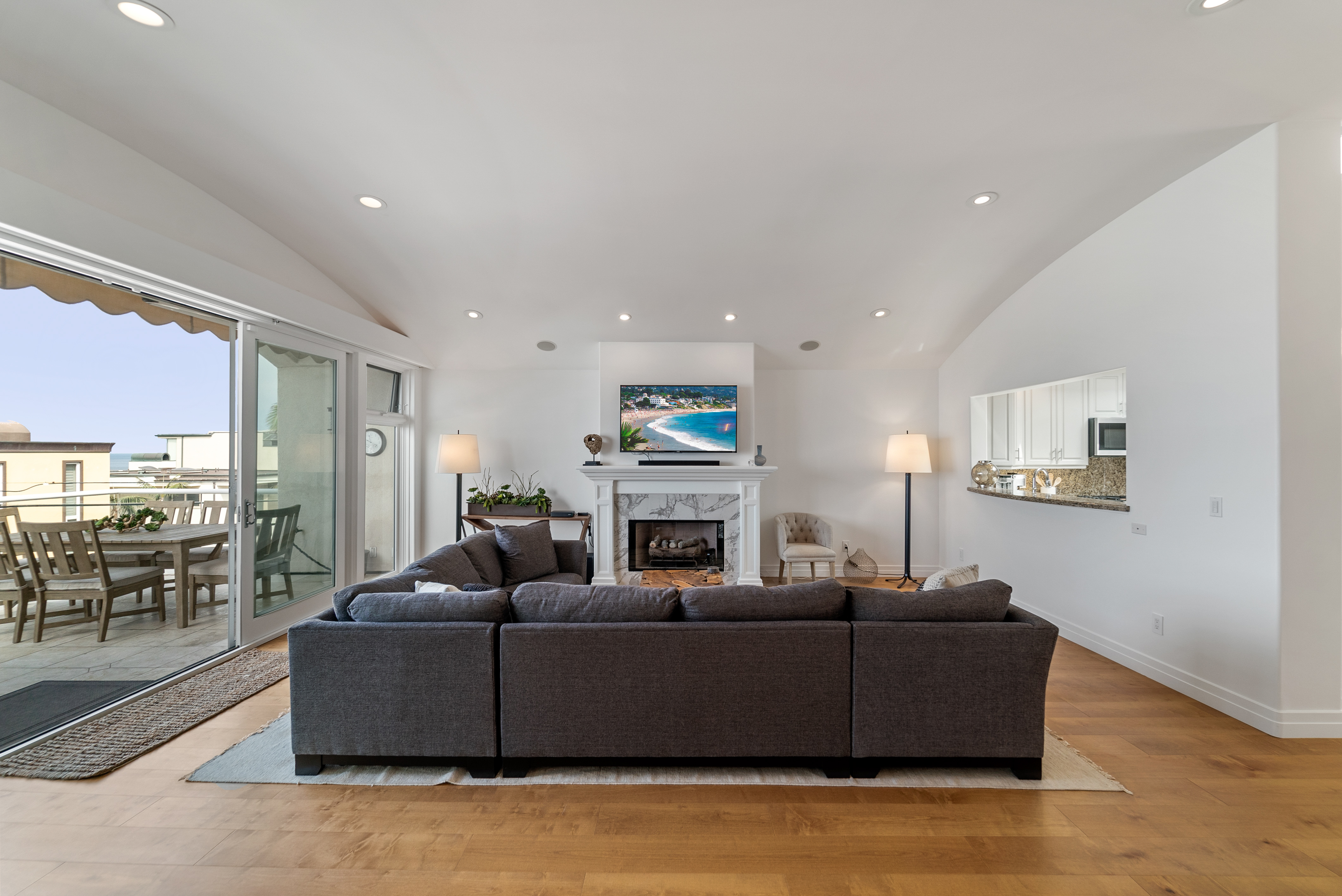 Expansive multi-use space with ocean view as its backdrop. Kick back on the huge sectional sofa, in the arm chair seating area, or around the game table. Sliding glass doors lead out to a large balcony with glass railing that shows off the stunning coastal views. Take in the sea breeze while relaxing at the outdoor dining table or the outdoor sectional sofa and coffee table.