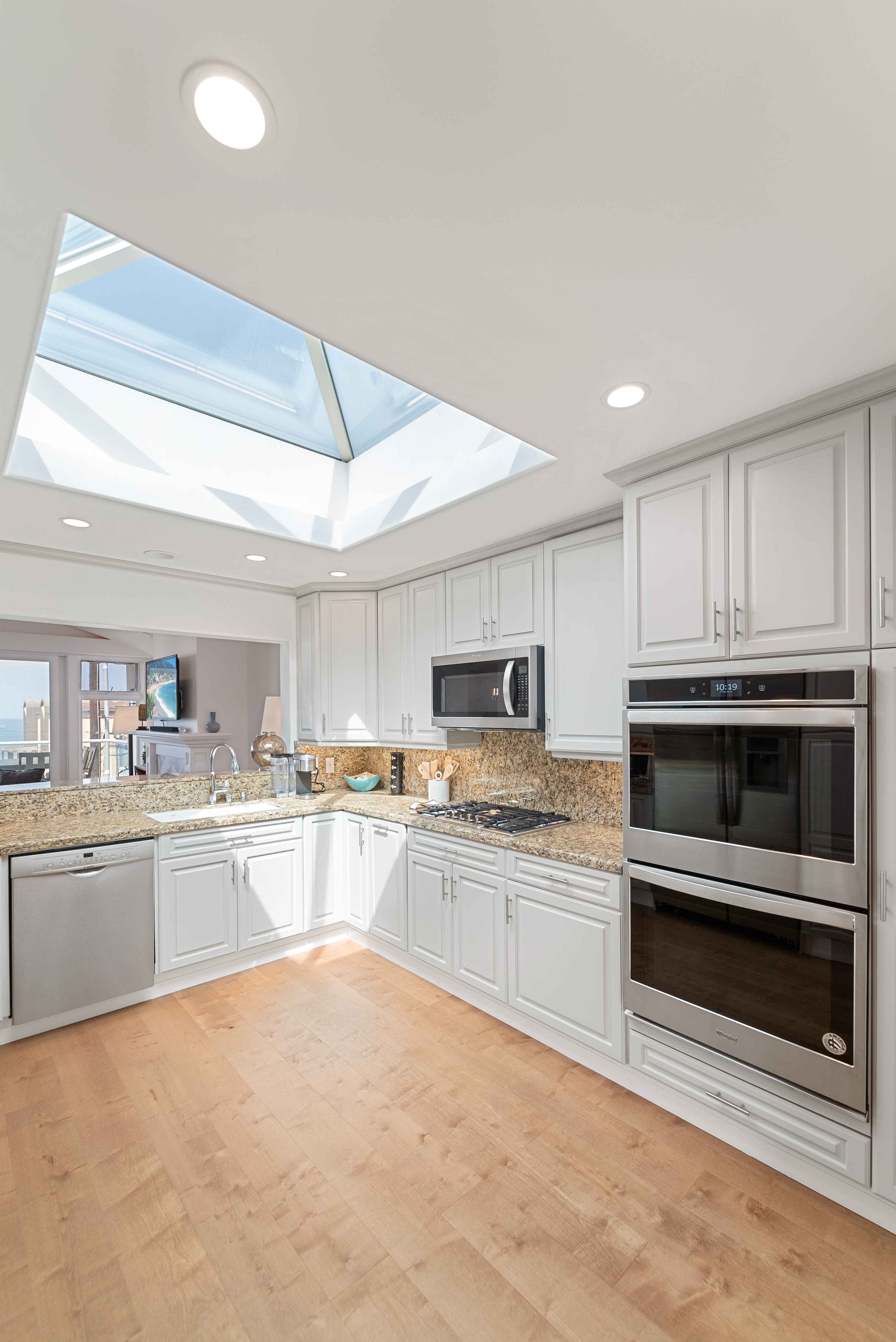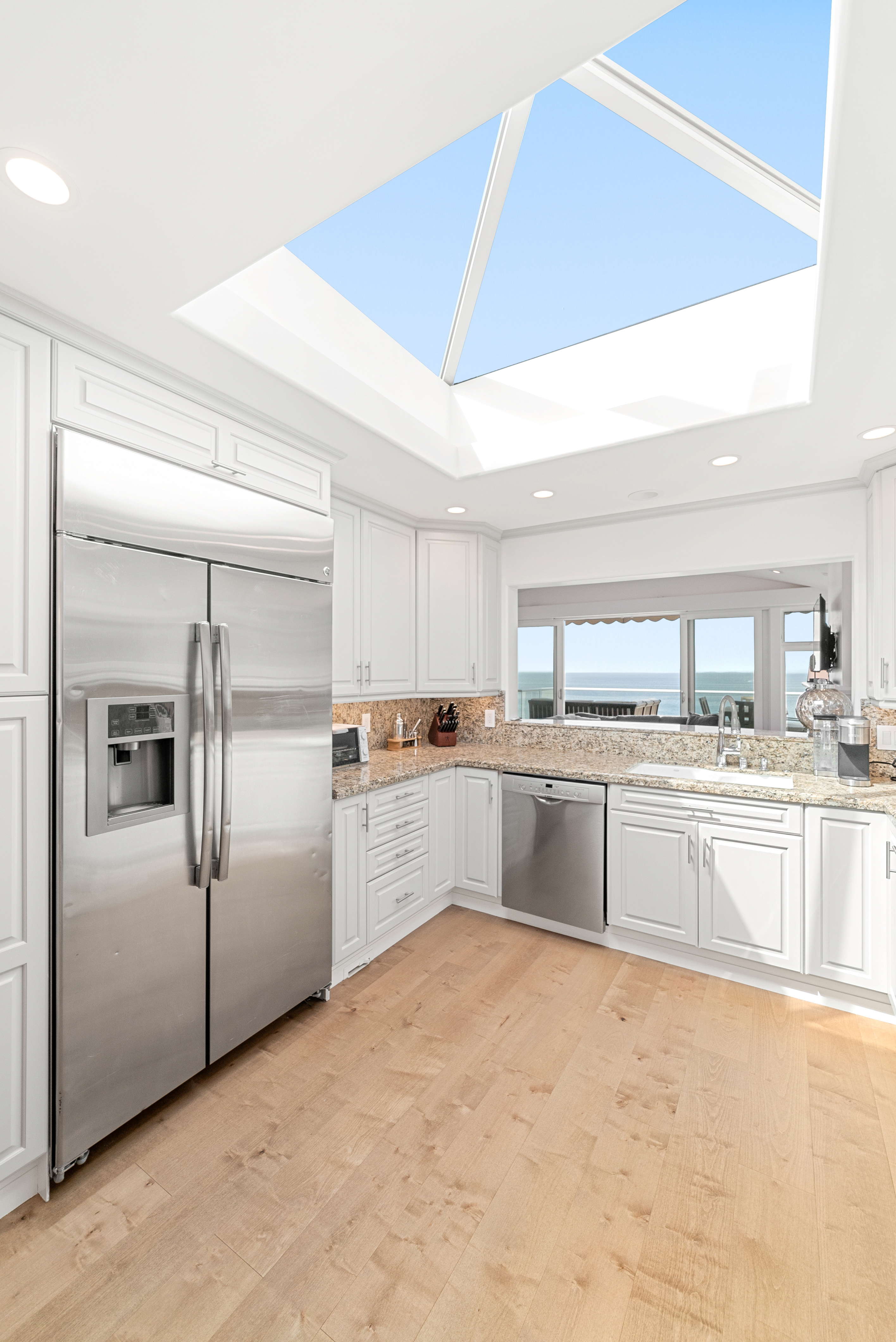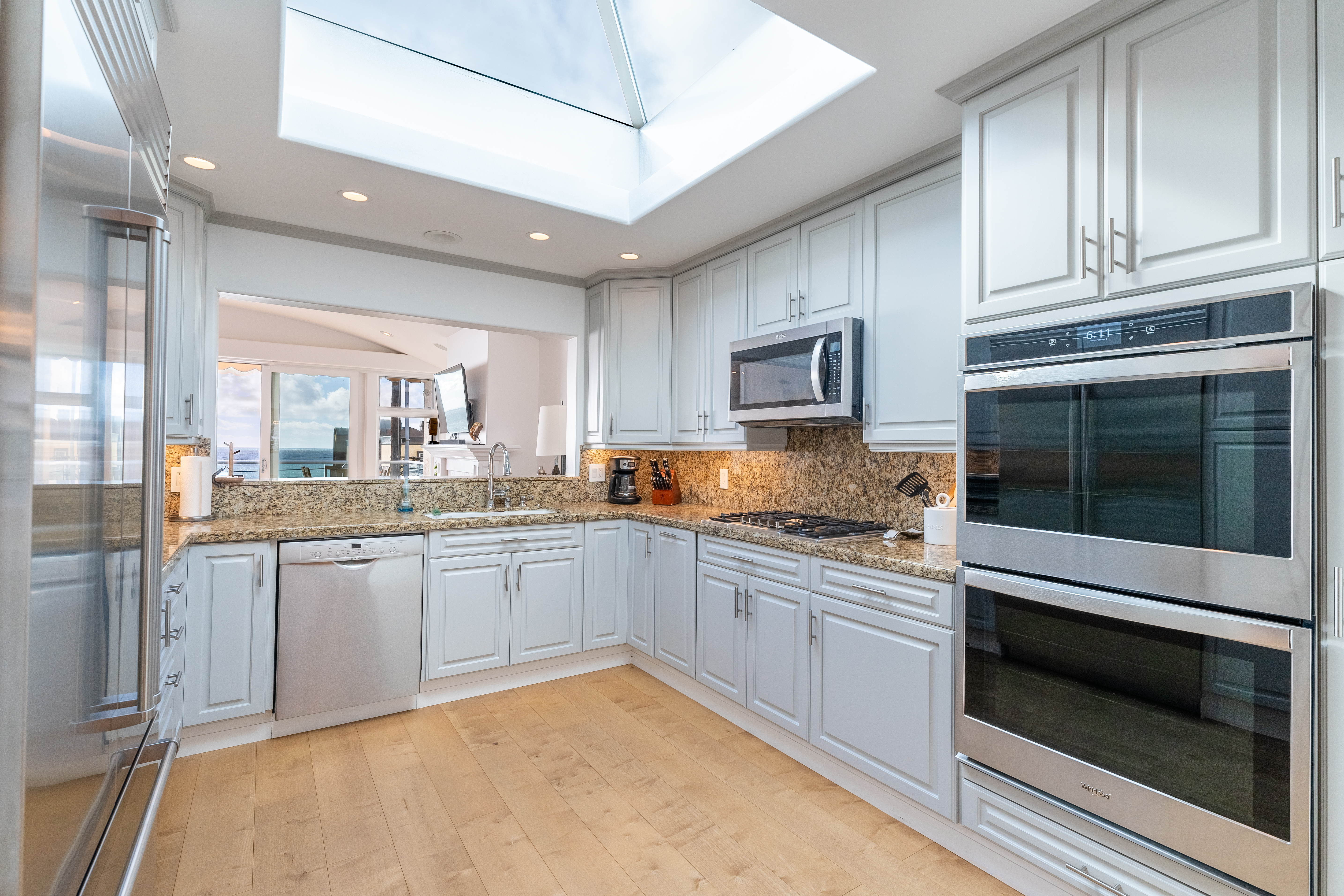 Just off the front entryway you’ll find the dining room with a table and seating for 6, along with a buffet cabinet. This space opens up to the generously sized kitchen, which features a large skylight and a cut-out bar overlooking the living room, offering breathtaking ocean views. A convenient half bath is located off the front entryway.